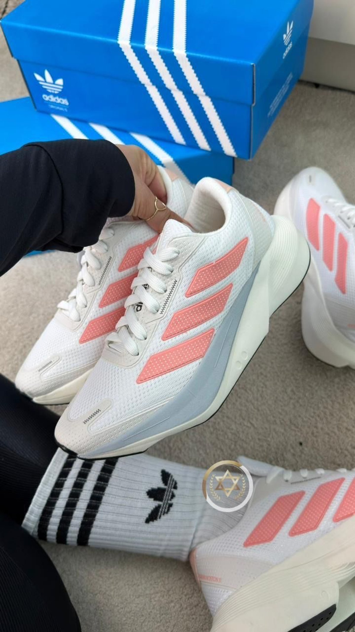 Las zapatillas que se muestran son lasadidas Adizero Boston 13en color blanco y gris. Este modelo es la evolución más reciente de la línea Boston, diseñada específicamente como un calzado de entrenamiento de alto rendimiento para distancias que van desde los 10k hasta el maratón
